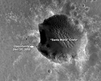 ![]() Color View From Orbit Shows Mars Rover Beside Crater NASA's Mars Exploration Rover Opportunity has nearly completed its three-month examination of a crater informally named "Santa Maria," but before the rover resumes its overland trek, an orbiting cam ... more | .. |