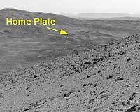 Pasadena CA (JPL) Sep 27, 2007Mars Exploration Rover Opportunity has reached its science team's first destination for the rover inside Victoria Crater, information received from Mars late Tuesday confirms. Opportunity has descended the inner slope of the 800-meter-wide crater (half a mile wide) to a band of relatively bright bedrock exposed partway down. |